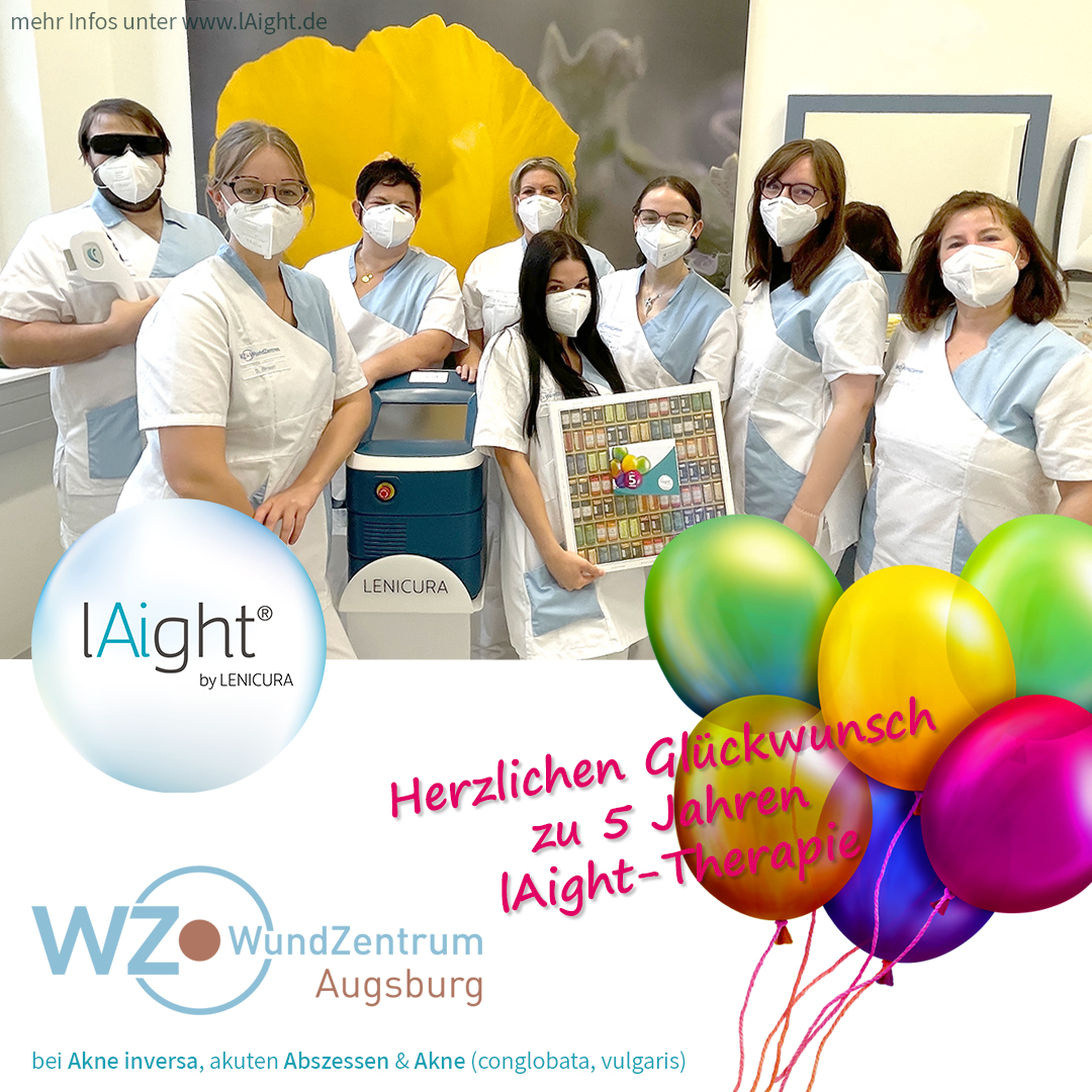 Die spezialisierten Pflegefachkräfte des WZ-WundZentrum in Augsburg kennen das chronische Krankheitsbild der Akne inversa schon viele Jahre aus der spezialisierten Behandlung der oft großflächigen Wunden nach operativen Eingriffen. Wenn es zu einer Wunde kommt, erfordert die anschließende optimale Wundbehandlung Zeit, Fachwissen und Erfahrung. Die WZ-WundManager betreuen die Ai- Betroffenen bereits seit 2017 auch zusätzlich mit lAight®. Sie stehen den Patienten als erfahrene und kompetente Spezialisten zur Seite und arbeiten mit niedergelassenen Fachärzten für Dermatologie oder Chirurgie zusammen, die die Akne inversa Patienten ärztlich betreuen. Eine sorgfältige und auf den Patienten abgestimmte Therapieempfehlung kann unterstützend den Heilungsprozess verkürzen. Das WZ Augsburg betreut die Patienten mit größtem Verständnis und fundiertem Wissen über die Erkrankung in all ihren Ausprägungen und Folgen, den Möglichkeiten der Behandlung und aller unterstützenden Maßnahmen, die der Patient selbst mit einbeziehen kann.